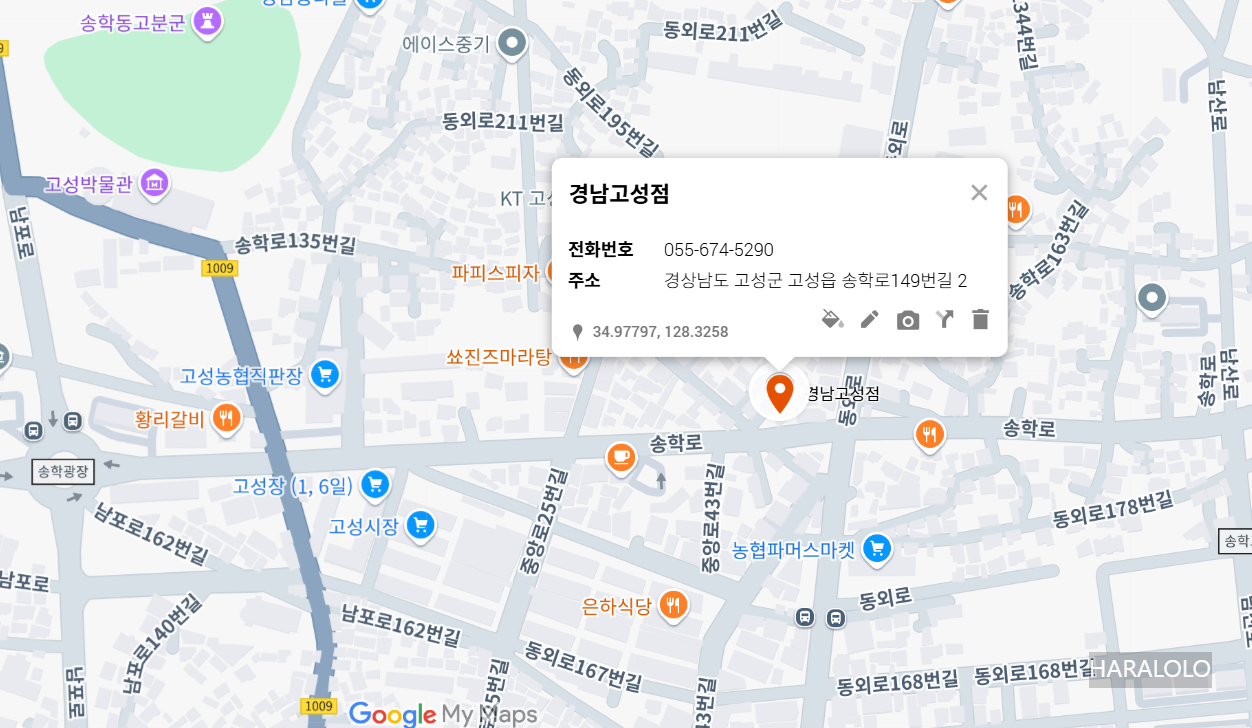 | 경남고성점 | 055-674-5290 | 경상남도 고성군 고성읍 송학로149번길 2 |